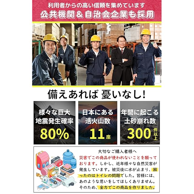 【抗菌率99.9%・消臭率97.8%】汚物を放置すると、バイ菌が繁殖しやすくなります。当社の簡易トイレ用凝固剤は衛生管理にこだわり、銀成分を配合して99.9%の抗菌効果を発揮します。さらに、緑茶成分が排泄物の5大悪臭(アンモニアなど)を即時中和し、消臭効果の持続時間が従来比で30%向上しました。これにより、緊急トイレ使用時の心理的ストレスを軽減します。安心してご利用いただける防災グッズです。