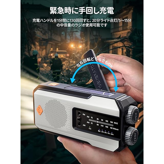 【緊急時に便利な3WAY充電】充電式ラジオは、電力の供給が絶たれたときに手回しやソーラー充電で使用できるため、非常時にも便利です。付属Type-C ケーブルで携帯ラジオも充電できます。(注:ACアダプターは別売り)1回満充電して、最大180日の長期間待機可能です。手回し充電に使うハンドルは本体と一体になっているので、携帯性にも優れています。手回しハンドルを1分間に130回回せば約15分間ラジオを聞けます。20分ライト点灯します。