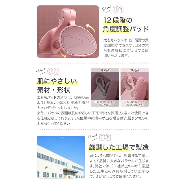 ✅【 12段階の角度調整ができるパッド 】太ももパッドはかんたんに本体から取り外すことができ、12段階の角度調整もできます。そのためご自身の太ももの形状に合わせて、太ももパッドの位置を調整することも可能です。