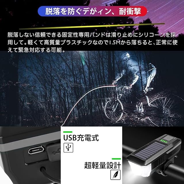 商品名:自転車ライト ソーラー充電 ロードバイクライト IPX-5防水 自転車用 らいと クロスバイクライト バイクライト 自転車ヘッドライト USB 充電式 軽量 小型 Led ライト自転車 3つ調光モード 日本製 无喇叭設計[ブラック]