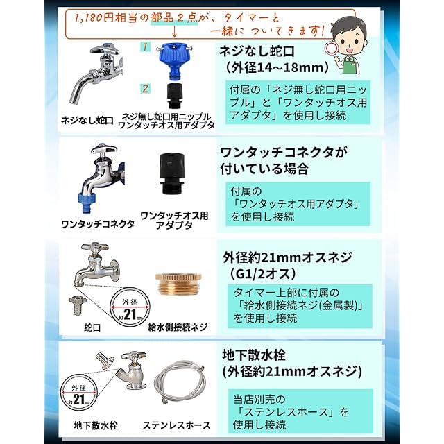 当店商品「自動水やり器 大型パネル版 スターターキット」内の散水タイマー単品商品でございます。<br /> 散水タイマーのみをご希望の場合や、必要な構成部品が決まっている方はこちらをご購入ください。<br /> <br /> ・大型液晶パネル搭載&分かりやすい日本語表示により、画面を見ながら簡単なボタン操作で設定可能になりました。<br /> ・日本語マニュアルも付属します。<br /> ・1日に1〜4回、設定した時間に散水可能です。<br /> ・散水時間は「0〜599分」、散水頻度は「毎日〜29日おき」まで設定できます。<br /> ・初めて設置した時や流量を調整したい時に手動で散水することも可能です。<br /> ・単3アルカリ乾電池×2本を使用します。<br /> <br /> □■NEW 蛇口接続用部品が付属します!■□<br /> 【取付可能な蛇口(給水側)と接続方法】<br /> <br /> ・ネジ無し蛇口(蛇口径14-18mm):付属の「ネジ無し蛇口用ニップル」と「ワンタッチオス用アダプタ」を取り付けることで接続可能です。<br /> ・蛇口にワンタッチコネクタが付いている場合:付属の「ワンタッチオス用アダプタ」を取り付けることで接続可能です(お客様環境のコネクタによっては取り付けできない場合がございます)。<br /> ・蛇口(ネジ付き)の接続口がG1/2オス(ネジ外径が約21mm、呼び13):付属の金属ネジで直接取付可能です。※一回り大きい外径約26mmの蛇口は水漏れしやすくなるため取付いただけません。<br /> ・地下散水栓(接続口がG1/2オス):当店別売りのステンレスホースを使用いただくことで接続可能です。<br /> <br /> ※お届けの際、液晶画面には保護フィルムが貼られておりますので、剥がしてご使用ください。<br /> ※タイマーに付属する9mmホース接続用部品の色は画像と異なる場合がございます。予めご了承ください。<br /> <br /> ■ご注意<br /> ・本製品は一般家庭での屋外散水用です。それ以外の目的には使用しないでください。<br /> ・設置後は必ず接続部より水漏れがないか確認してください。<br /> ・タイマーは高温になると液晶表示等に影響がございますので、直射日光が当たらない場所に設置するか、カバー等で直射日光が当たらないよう覆っていただくようお願い致します。<br /> ・蛇口側のネジの状態によっては取り付け後に水漏れが発生する場合がございます。その際は配管用シールテープをネジ山に巻いてお試しください。<br /> ・設置後初めてのテストの際は、蛇口からの水を弱めにし、徐々に強くするようにしてください。<br /> ・その他ご注意点や操作方法は、付属の取扱説明書をご覧ください。<br /> ・本商品は水道からの水圧を利用して散水する商品です。そのため待機中も水道の蛇口を開けた状態で使用いただく必要がございます。ポンプ式ではございませんので、本商品に水を自動で汲み上げる機能はございません。<br />