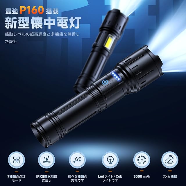 【最新XHP160超高輝度LED】懐中電灯は最新のアップグレードされたledライトチップを搭載するので,懐中電灯は高い出力と強力な集光能力を発揮します,暗闇でも広範囲を明るく照らし出すことができます。この懐中電灯は最大10000ルーメンと日常生活で使用するには十分な明るさを持ち、充電式で長時間のご利用が可能となっています。