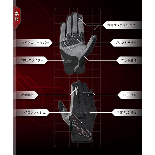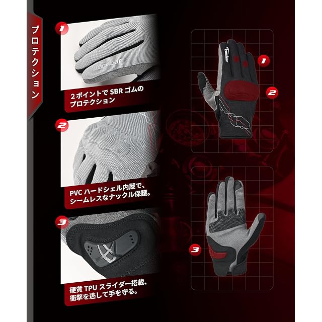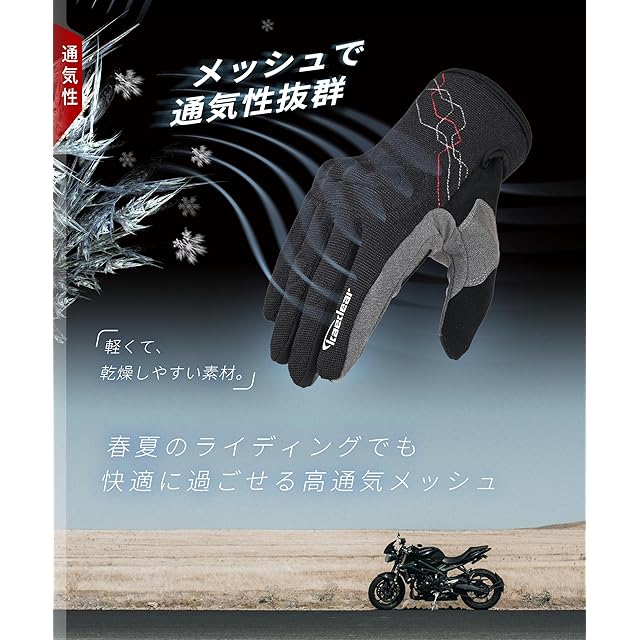 【安全性と利便性を追求した設計】 カジュアルで軽量なデザインでありながら、安全性をしっかりと確保している点が特徴です。手のひらには強固なスライダープロテクターを、ナックル部にはナックルプロテクターを備えており、万が一の際にもライダーの手を守ります。さらに、独自の縫製技術により、グローブをつけたままスマートフォンの操作が可能で、使い勝手の良さも考慮されています。