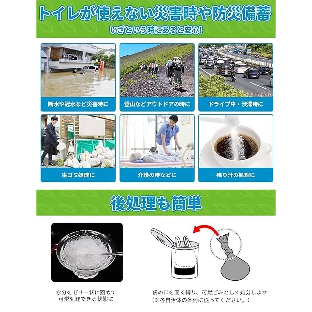 【半永久長期保存可能&様々なご利用シーン】安定な原料をしており、直射日光と高温多湿を避けて保管することで15年間長期保存可能です。非常時やアウトドア活動、家庭内での液体廃棄物の処理を簡単かつ衛生的に行うことができる商品です。地震・台風・停電・大雪・洪水・交通渋滞などの非常時、車中泊、長距離運転時のトラブル、BBQや鍋料理後の残り汁処理など多様なシーンで活躍します。