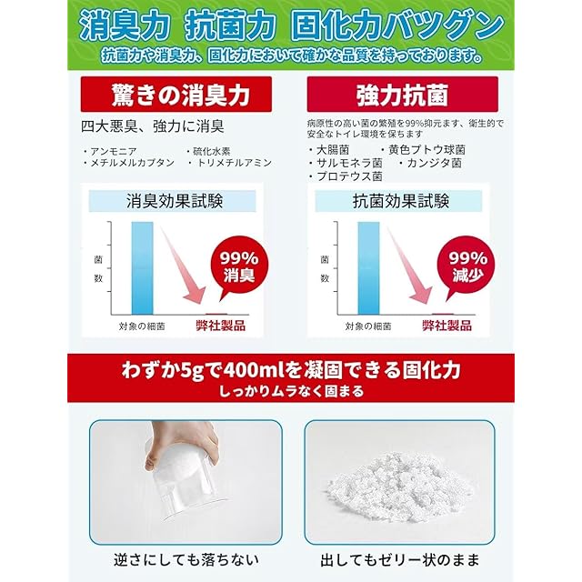 【高吸水性ポリマー、抗菌消臭効果バツグン】凝固剤が1包10gに増量で吸水量が従来品に比べ2倍にUP、汚物の水分を吸収し、ジェル状にするので、素早く清潔に処理できます。吸水性能が高く、汚物などでの処理にも適しています。災害時はライフラインが止まり、ゴミがすぐに出せず衛生環境が悪化しやすくなります。凝固剤は第三者機関での抗菌・消臭試験をクリアした確かな品質です。「抗菌」「消臭」機能がり、汚物を素早く凝固させ臭気の拡散を最小限に抑えます。災害時に悪化しやすい衛生環境や悪臭対策のお役に立ちます。