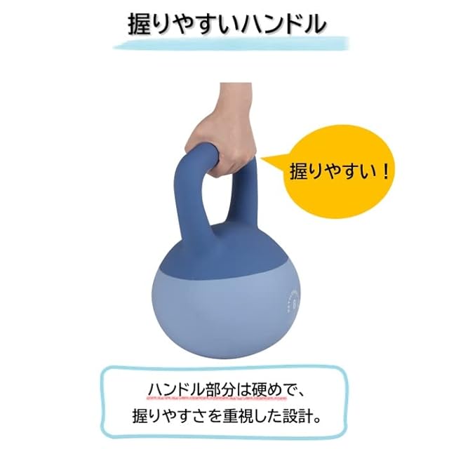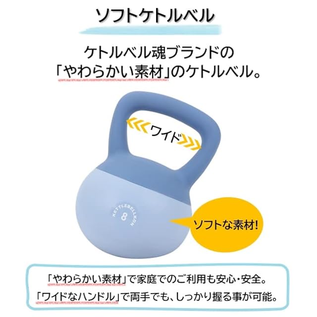 ・【やわらかい素材のケトルベル】ケトルベル魂ブランドの「やわらかい素材」のケトルベル。 衝撃を吸収する「やわらかい素材」のため、体にぶつけた際の衝撃も大幅に軽減されます。・【幅広いハンドル窓】ハンドル部分はワイドで硬めの素材のため、両手でもしっかり握ることが出来、ハンドルから手が離れるリスクも軽減されます。・【ご家庭での利用に最適】表面の素材はPVC、球体内部は砂鉄・砂のため、床や壁への衝撃も大幅に緩和。ご家庭内でも安心してトレーニング頂けます。・【重量バリエーション】★2kg 4kg 6kg 8kg 10kg 12kg 16kgを取り揃えています。★モニターの発色の具合によって実際のものと色が異なる場合がございます。製造ロットにより、商品本体の色あいが異なる場合がありますこと、予めご了承の程よろしくお願いいたします。・★ケトルベルの重量ごとに砂の量と空洞部分の割合が異なりますため、重量によっては砂の揺れ(砂の音)を大きく感じる事が有ります事、予めご了承の程お願いいたします。★日光により、色あせが生じることがありますのでご注意下さい。ゴムとの接触により、変色することがありますのでご注意下さい。