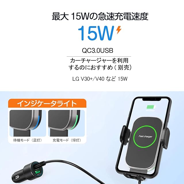【Qi規格に対応、最大15Wを供給できる】急速ワイヤレス充電機能と80%の高い変換率により従来に比べ2倍の早さで充電が可能です。ワイヤレス充電はこれひとつで:最新のiPhoneやSamsung製スマートフォン主要モデルを含む、ワイヤレス充電に対応する機器と互換性があります。スマホの有無を自動で判断、スマートフォンセット時はエンジンの入切でうっかり開かない親切設計できました。ご注意:急速充電の場合には、別売りのQC3.0USBカーチャージャーを併せてご利用ください。