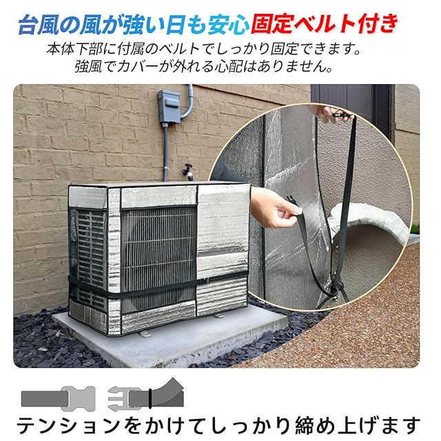 【遮熱・劣化防止】:エアコン室外機カバーの表面には直射日光を反射する新型アルミフィルムを採用。 内側に断熱綿を使用し、エアコン室外機への熱の侵入を防ぎます。日・雨・雪・風・埃からエアコン室外機を全面的に守ります。丁寧な裁縫技術が施工されて、丈夫で長時間使用できます。
