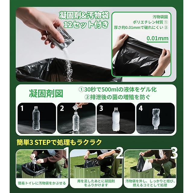 【パッケージ内容】本体サイズ:約幅29cm奥行35.5cm高さ29cm(使用時)、約幅29cm奥行33.5cm高さ10.5cm(収納時)、重量:約1.35KG、容量:約20L、材質:本体(ポリプロピレン)、バッグ(ポリエステル)【セット内容】本体、排泄袋×12枚、収納バッグ、取扱説明書