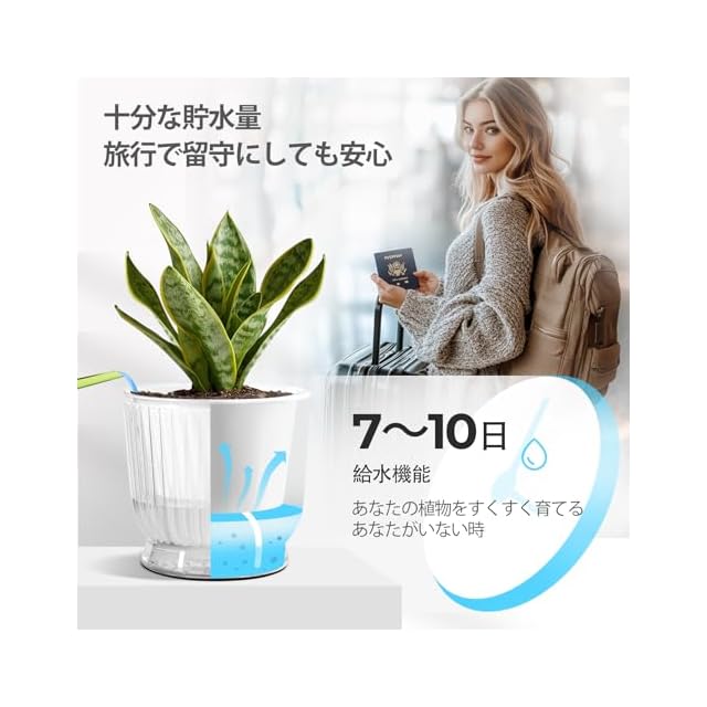 「自動給水機能付き」革新的な2層設計を採用し、綿ロープで外部の貯水層の水分を吸収し、インナーポットの土に自動的に水を供給する仕組みです。水不足または過剰な水分供給による根腐れなどのトラブルを軽減します。週に1〜2回の水やりだけで、時間を大幅に節約できます。出張や旅行中でも、植物が枯れる心配はありません。したがって、多忙な植物愛好家や初心者にとっては、理想的な選択です。