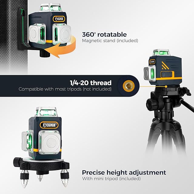 CIGMAN 3Dレーザー墨出し器 リモートコントロール 3x360°グリーンレーザー 30メートル作業範囲 磁気回転スタンド Type-C充電ケーブル付き(CM701)