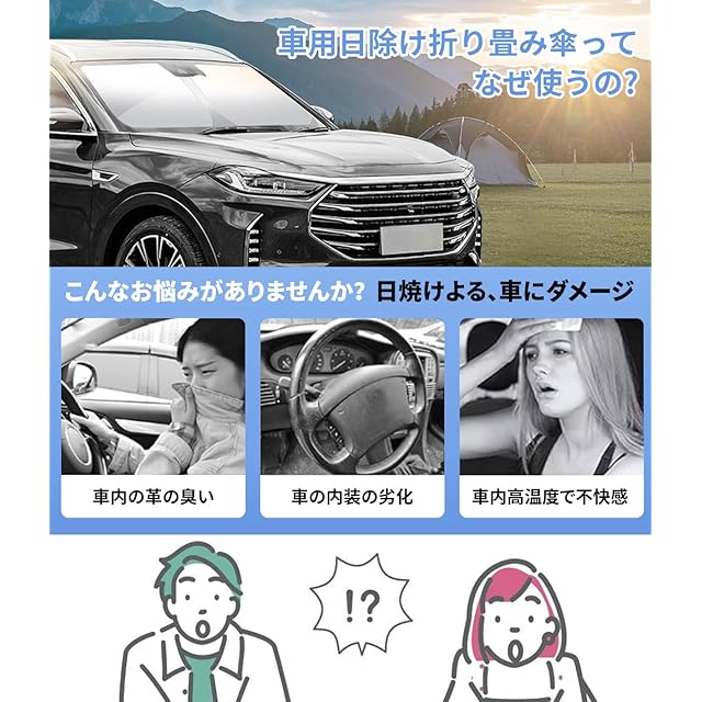 この車用サンシェード傘は、紫外線や熱を反射し、日焼けによる車内の劣化を防ぎ、夏場に屋外駐車して車に戻ると蒸し暑く感じるという悩みを解決します。