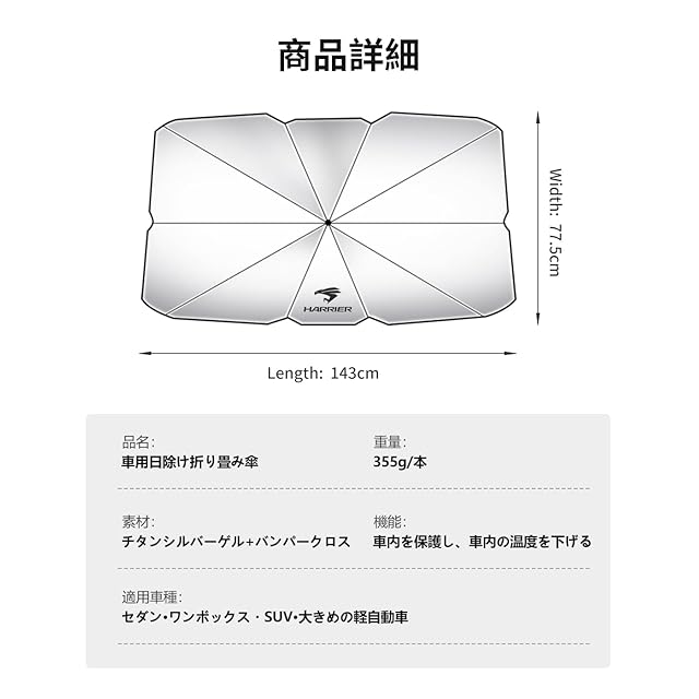 商品名:ハリアー 専用 車用 サンシェード 傘 HARRIER 対応 車 フロンドガラス用 日除け傘 自由に曲がるハンドル ハリアー 30系 60系 80系 S G グレード 適用 カーサンシェード 高遮光性 断熱 折りたたみ式 UVカット ダッシュボード保護 カーアクセサリー