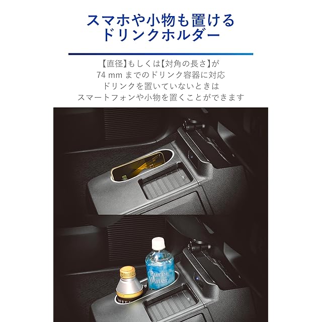 ●様々なドリンク容器に対応したドリンクホルダー×2 コンビニコーヒーだけでなくペットボトルや太缶、細缶まで使用できます。直径74mmまでのカフェカップ、缶、丸型ペットボトルや、対角寸法74mmまでの角型ペットボトルを置くことができます。 ドリンク容器以外でも車用の灰皿や芳香剤、空気清浄機なども直径74mmまでであれば置くことができます。