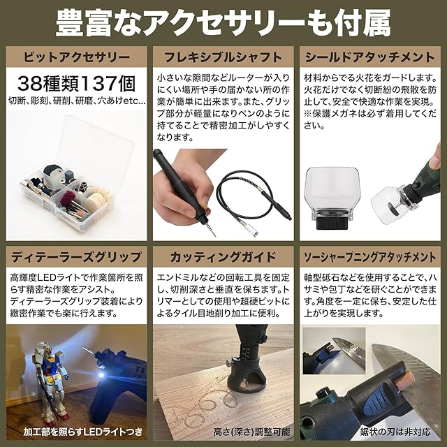 【便利なアタッチメントも豊富にセット】一般的には別売となるフレキシブルシャフトを標準でセットしています。フレキシブルシャフトを装着すればモーターのある本体部分と分離されるため、小型軽量なペングリップ部の保持のみで作業が可能となります。極めて繊細な作業もペンで描くような軽い操作感で行えます。またガンタイプの形状を採用したディテーラーズグリップは作業性を向上させる操作感を得られるだけでなく、LEDライトユニット(単4電池式/テスト電池2本付属)を内蔵しており、暗所での作業や加工物を明るく照らした状態での作業にも配慮しています。シールドアタッチメントは切り子や切断片などの飛散を防止するもので、金属切断やワイヤーブラシでの研磨の際に作業者を保護します。カッティングガイドは刃物を砥石ビットを用いて研ぐ際にサポートするもので、平行のガイドと30°の角度を持つガイドにより刃物の研ぎ作業を高速かつ高精度に行うことが出来ます。