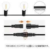 【商品仕様】コード長:約15m ソケット間隔:約55cm 防水仕様:IP44 電球消費電力:1W 色温度:2700K電球色 ビーム角:360º 電源:AC110V 50/60Hz ソケット個数:25個 重量:約1.8kg 使用温度:-20℃~40℃