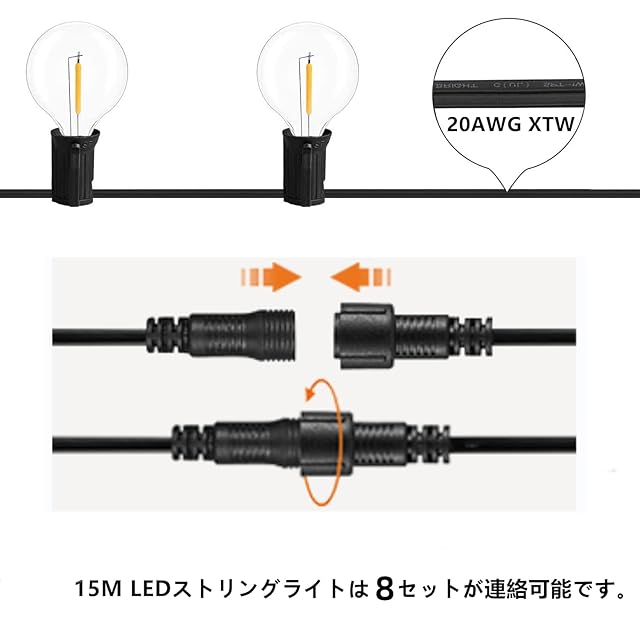 商品名:防雨型LEDストリングライト 15M 25個LED電球付き E12口金 2700K電球色 PC素材 破損しにくい 連結可能 LEDイルミネーションライト屋内/屋外照明 ガーデンライト クリスマス イルミネーション 装飾ライト誕生日パーティー電飾 結婚式飾り