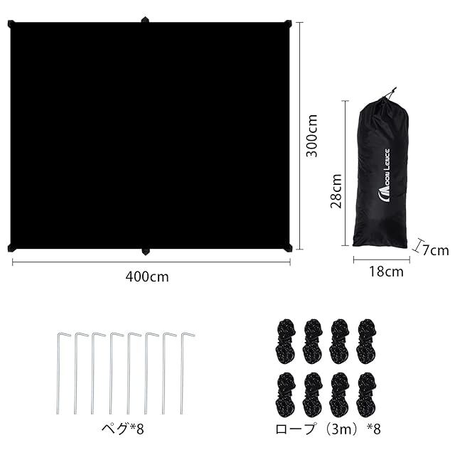【タープ仕様】生地:190Tポリエステル、ブラックガム塗層 / 耐水圧:3000mm / 本体サイズ:3m×4m / 収納サイズ:約28x18x7cm / セット重量:約1.34kg(ペグ&ロープ含む) 内容物:タープ本体×1、自在付きロープ×8本、ペグ×8本、収納袋×1枚(ご注意:本製品にポールは付属しません。別途を買い求めください。)
