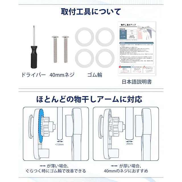 1.【ご購入前の必ずご確認ください】:弊社の物干し竿延長バーは直径42㎜に対応しております。穴の直径が42㎜未満の物干し金物、幅が20mm以上の物干し金物、樹脂製の物干し金物には取付不可となります。ご了承ください。ご注意:ご購入前に、ご自宅の物干し金物が取り付け可能かどうかを必ずご確認ください。両方の固定具を奥側に設置してください。正しい向きで設置されていない場合、物干し竿の高さに違いが生じる可能性があります。ご注意:12mm以下の物干しは薄くて、装着する場合、付属のゴム輪でぐらつく状況を改善できます。また、物干しは厚く場合、40mmのネジで固定できます。