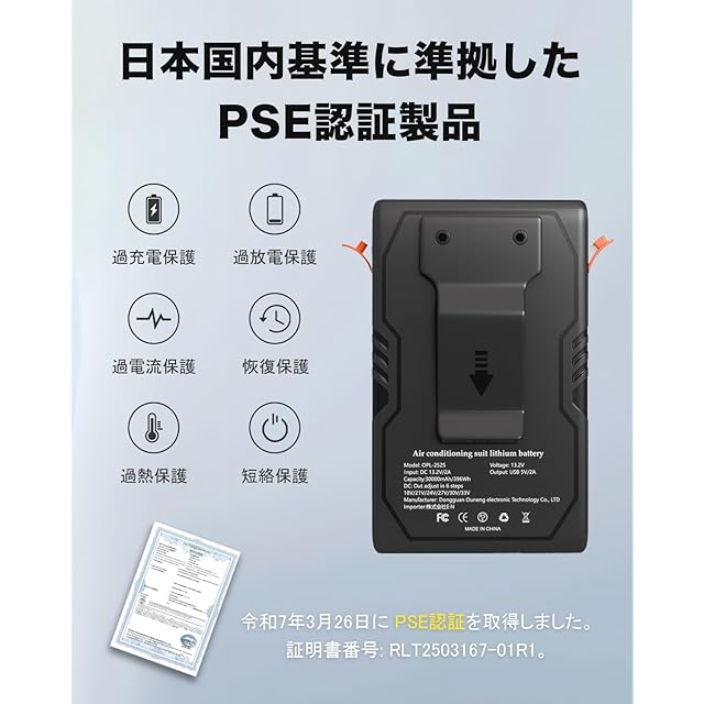 ✅【PSE認証済み・8重安全保護で安心】本ファンバッテリーセットは、日本の電気用品安全法(PSE)に適合し、過充電・過放電・過電流・過熱・短絡・逆流・過負荷など8つの保護機能を備えた安全設計。高品質リチウムイオン電池に加え、PTCヒューズや温度制御チップも内蔵し、長時間使用時も安心してご利用いただけます。
