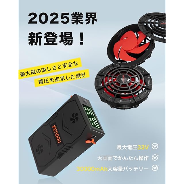 ✅【最大限の涼しさと安全な電圧を追求した設計】本製品は2025年最新型、最大電圧33V・6段階風速(33V/30V/27V/24V/21V/18V)に対応したファンバッテリーセット。高出力ながら安全性にも配慮し、使用シーンや体感温度に応じて柔軟に風量を調整可能。猛暑時の屋外作業でも、最大限の涼しさと安定した動作を両立します。
