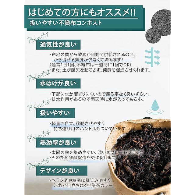 ✅✅✅【不織布生地のメリット】 厚手の不織布生地で作られているため、例えばスコップで中身をかき回す際にも傷や穴があきにくいです。 通気性がよく、酸素が加わり細菌が活性化する環境を簡単に作ることができます。 透水性がよいため、余分な水分は排出し、プラスチックの商材に比べ、カビや不快な臭いを防ぐことができます。