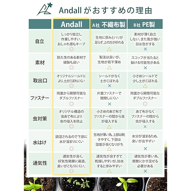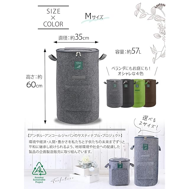 ✅【おしゃれコンポスト】コンポストとは、ご家庭からでる生ごみや、野菜くず・落ち葉などの有機物を微生物の働きで分解・発酵させて作られた熟成堆肥の事です。より身近にサスティナブル生活を満喫いただける様、おしゃれなコンポスト容器を企画させていただきました。<BR> ✅【しっかり自立する不織布コンポスト容器】 一般的な大きなコンポスト容器は一度設置してしまえば動かすのに一苦労。 しかしこの不織布コンポスターはとても軽く折りたためることもできるので持ち運びが簡単。 また、不織布コンポストは生地が薄く自立しない商品が多い中、アンダルのコンポストは厚手の生地を使用しておりしっかり自立し、マンションのベランダなどでもご利用いただけます。<BR> ✅【不織布生地のメリット】 厚手の不織布生地で作られているため、例えばスコップで中身をかき回す際にも傷や穴があきにくいです。 通気性がよく、酸素が加わり細菌が活性化する環境を簡単に作ることができます。 透水性がよいため、余分な水分は排出し、プラスチックの商材に比べ、カビや不快な臭いを防ぐことができます。<BR> ✅【ご使用方法】 土や枯葉などで床を作りよく水を切った生ごみや落ち葉を入れます。 生ゴミと一緒に、米ぬかや燻炭、竹炭などを入れてかき混ぜるだけ。 週一回を目安に撹拌すれば数か月で有機堆肥の完成です。環境にやさしいサスティナブル生活を始めましょう。<BR> ✅【お買い物は日本企業で。類似品にご注意ください】見た目の画像は同じような商品でも、作る工場や産地・品質・対応は全く違います。すぐに壊れる・色が画像と違う・連絡をしても返事がない等色々なトラブルがございますので、販売業者は慎重にお選びくださいませ。