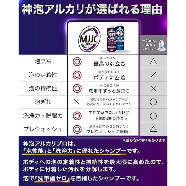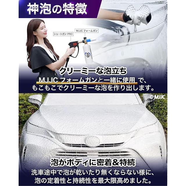 本製品はMJJCフォームガンのために開発された泡洗車用のシャンプーです。ボディへの泡の定着と持続性に優れた性能を発揮し、洗車傷を防ぐ効果があります。泡が消えにくい特性があります。(※泡が消えやすいシャンプーを必要とされている方の用途には向きません。)