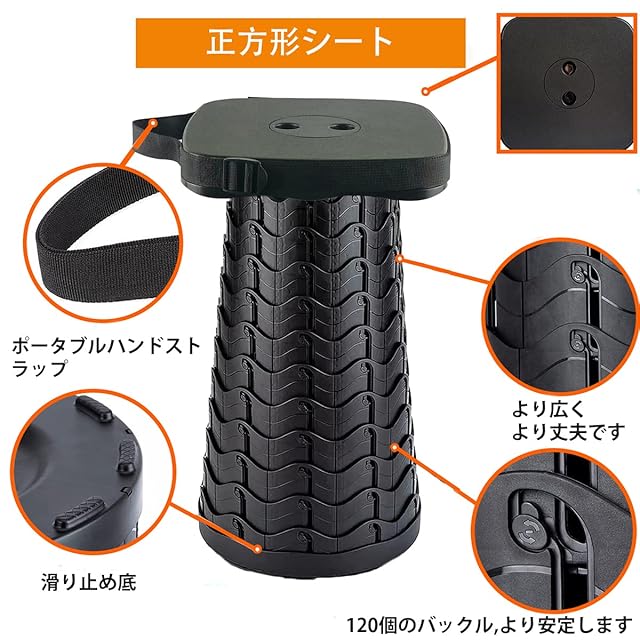 【安全&安定】-私たちの伸縮式スツールは高強度エコエンジニアリングプラスチック材料を採用し、伸縮可能折りたたみスツールの積載能力が強くて、ダイナミックは220kgの耐荷重は262kgで、気楽にお客様のニーズに満足できます。 折りたたみスツールは120箇所の緊密連結バックルと滑り止め底があり、安全に座ることができます。 スムーズなカーブがダイレクトに見え、独特の開閉がスムーズで、しっかりとロックします。