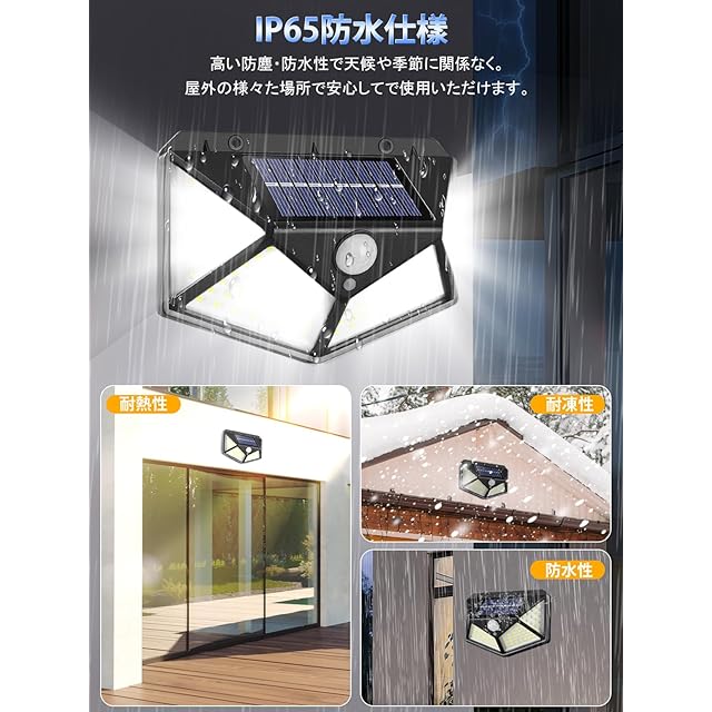 商品名:「2025新版高輝度」ソーラーライト 人感センサー【270°広角照明・4面発光・3つ知能モード・自動点灯】太陽光発電 電気代0 IP65防水防塵 100LED 設置簡単 電池交換不要 玄関/廊下/庭/壁掛け/駐車場/物置/停電時適用 防犯 地震 津波 台風 防災対応 (2個セット)