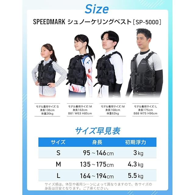 ■Sサイズ:身長目安 95〜146cm 初期浮力 3kg ■Mサイズ:身長目安135〜175cm 初期浮力 4.3kg ■Lサイズ:身長目安164〜194cm 初期浮力 5.5kg