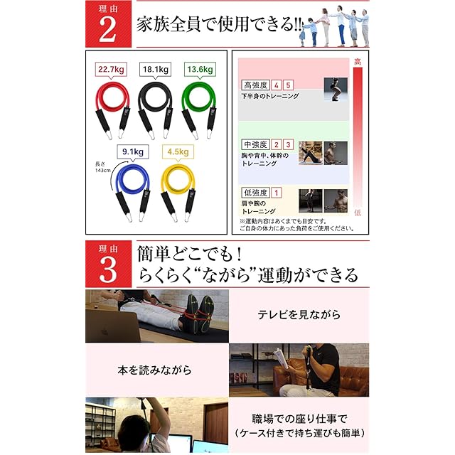 【 STEADYブランド累計60万点販売 】 メディア掲載多数、SNSでも話題の自宅フィットネス器具ブランド 【 ジムに行く必要なし 】 自宅で簡単らくらく全身トレーニング!トレーニングチューブがあれば背中、腹筋、大胸筋、腕、肩まで鍛えられます。 どこでも「ながら運動」コンパクトにまとまるので、どこでも持ち運び、職場のお仕事中や移動中でも運動ができます。 【 家族全員で使用できる 】負荷が5段階あるので、力のない女性やお年寄りもケガのリスクが小さく、目的に応じて負荷を使い分けできます。 ・二の腕、お腹の引き締め、美尻・肩、腰、背中のストレッチ、インナーマッスル・体幹トレーニング .