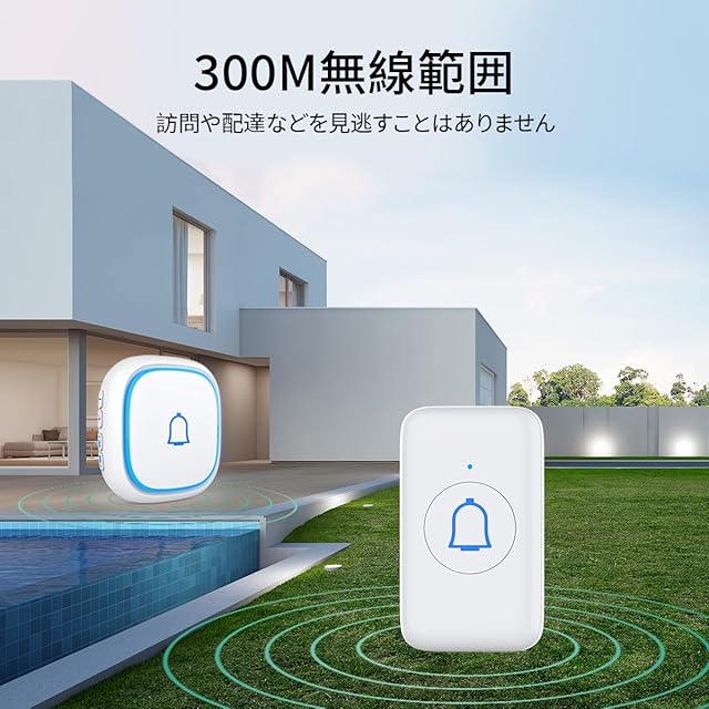 【300M無線範囲】電波範囲は障害物ないオープンエリアで最大300m、安定なワイヤレス信号があるため、他の部屋や階に居てもドアベルの音がはっきり聞こえます。このワイヤレスチャイムは教室、家、子供の寝室、遊び部屋、アパート、オフィスやその他の場所にも最適な選択です。注意:作動距離は周囲環境の障害物によって異なります。 送信機を金属製品(金属製ドアなど)の近くに置かないでください。