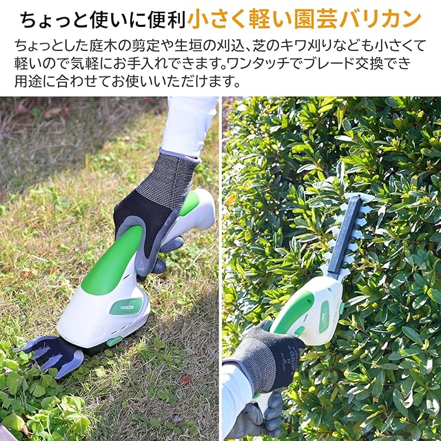 【特徴】ブレード交換でヘッジトリマーにもなる園芸用バリカンです。ちょっとした庭木の剪定や生垣の刈込、芝のキワ刈りなども小さくて軽いので気軽にお手入れできます。ワンタッチでブレード交換でき用途に合わせてお使いいただけます。モバイルバッテリーやノートPC等のUSBポートから充電できます。フル充電の所要時間の目安は約3時間で、充電が完了すると電池完了ランプが緑色に点灯します。電池残量が分かる残量表示ランプ付きです。左右のブレードロックボタンを押しながら、ブレードの取り替えができます。用途に合わせてワンタッチでブレード交換が可能です。始動させる際は安全ロックボタンを押しながらスイッチを握ります。スイッチを押している時だけ動作し、不意の起動を防ぐ安心設計です。使わないときはブレードを外してコンパクトに保管できます。