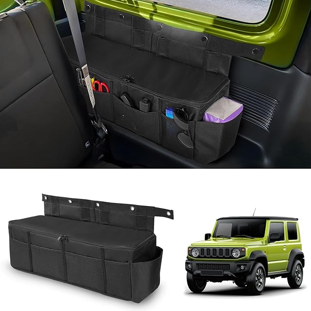 2.【スペース分け&使いやすい】:ダブルファスナー仕様で開閉しやすく、荷物などを持ち上げて収納に役立ちます。また、外側にはツール収納用のポケット、ジャンプスターター、工具類、洗車道具、タオルケット、ランタンなどの小物を収納でき、ジムニーの限られたスペースを有効活用!