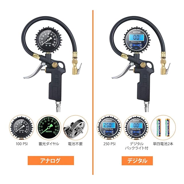 商品名:AstroAI エアゲージ タイヤゲージ エアチャックガン100PSI 689KPA 空気圧ゲージ 空気圧計 自発光機能 高精度 空気圧測定 空気入れ 空気抜き トラック 自動車 バイク 自転車に対応 日本語説明書付き