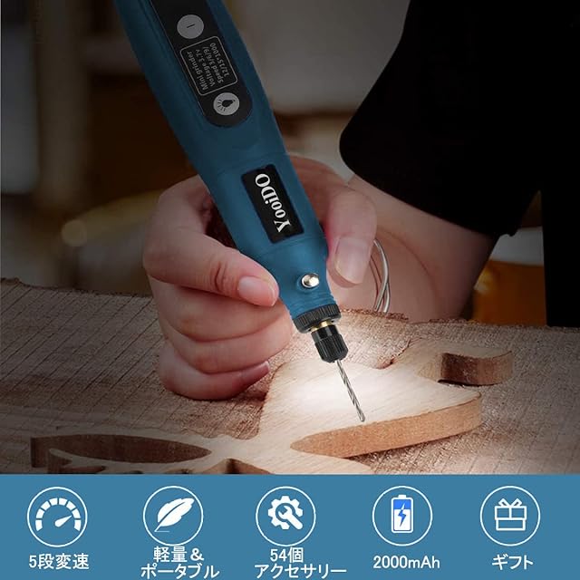【軽量&照明ライト付き】コンパクトルーターはペンサイズなので、片手でも簡単に作業できます。握りやすいハンドルは、長く使用しても疲れを感じさせません。128gの軽量でコードレスなので家だけでなく、屋外でも作業できます。軽いので細部の彫刻には特に最適、工作やアクセサリー作りなどに便利です。本充電式リューターはLEDライトも付き、夜や暗い場所のところで作業する時に、ライトをオンにすれば、はっきり作業することができる。