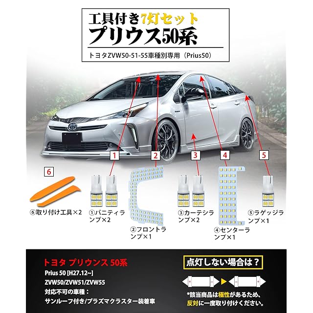 【製品情報】プリウス50系 LED車内灯(7灯セット)【適合車種】:トヨタ プリウス50系 ZVW5※非対応車種:サンルーフ付車【発光カラー】純正LED室内灯発光色 4500K(太陽光に近い) 【セット内容】:フロントランプ×1、センターランプ×1、バニティランプ×2、カ一テシランプ×2、⑤ラゲッジランプ×1(取付工具2枚付き)