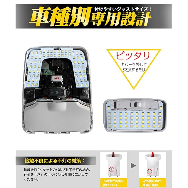 【車種別専用設計】純正ルームランプの形状を測って設計したため、ピッタリのサイズ。どちらがどこに入るかは一目瞭然で、素人でもチップにある矢印/説明書を参照して全車ライトを簡単にグレドアップできる。※年式グレード等で異なる場合がありますので、商品のセット内容とご愛車のルームランプをご確認の上でお買い上げお願います。もし不明なところがございましたら、いつでもご遠慮せず出品者までご連絡ください(日本語サービス対応)。