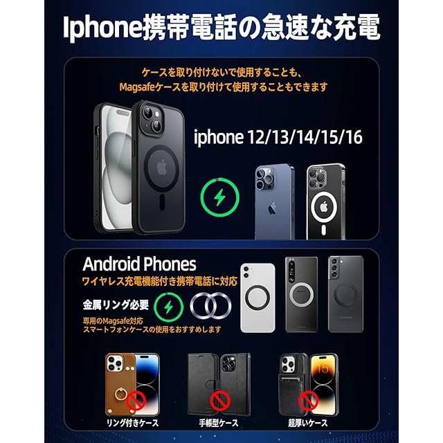 【QI全機種高速充電】MagSafe対応車載丸型エアコンワイヤレス充電器は、iPhone 16/15/14/13/12だけでなく、iPhone、SAMSUNG、Google、Sharp、LGなどの金属リング付きのすべてのワイヤレス充電対応携帯電話に対応しています。 MagSafe / 磁気ケースの取り付け済みおよび未取り付けのiPhone15/14/13/12シリーズに高速充電を提供します。他のQI機種の携帯電話や携帯電話ケースに金属リングを接続するだけで充電できます。