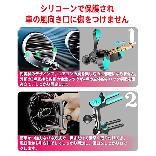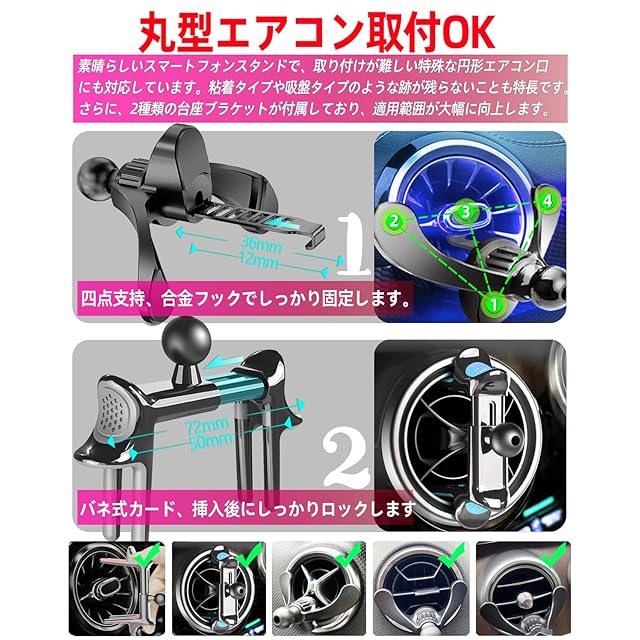 【98%の円形エアコン出力口に対応】フック式とスプリング式の2つのベース設計は、さまざまな車種の異なる円形エアコン出力口により簡単に対応できるようになっており、多くの円形出力口車種における電話ホルダーの取り付けに関する問題を解決します。取り付け後は非常に適合し、スタイリッシュで、エアコン出力口をしっかりと固定し、どんな道路状況でも安定しています。