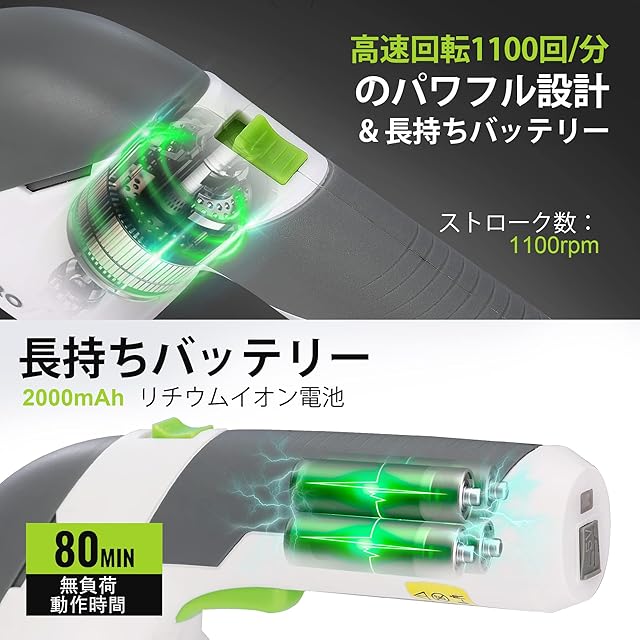 【効率向上7.2V充電式】7.2 V強力バッテリに全新進化、無負荷運転時間80分使用可能になります。コードレスタイプなので、コードが絡まったりひっかかる心配もなく、様々な場所で使用できます。USBケーブル(Type-C充電ポート)が付いて、ノートPC、車載充電などに対応充電できます。それに、普通の市販されているアタプター(5V/1A)にも接続して、充電ができるので便利です。フル充電の時間は約2-3時間です。充電が完了するとインジケーターライトが緑色に点灯します。ストローク数は一分1100回、剪定の効率が向上になります。ご注意:USBケーブルに接続する市販されている出力5V/2Aアタプターをご利用してくださいませ、(アダプター出力5V/1A)足りない場合、充電ができなくなります。出力電圧が過電圧保護動作値(アダプター出力5V/1A)を超えた際に、過電圧保護回路が動作し、出力を停止させ、充電ができなくなります。