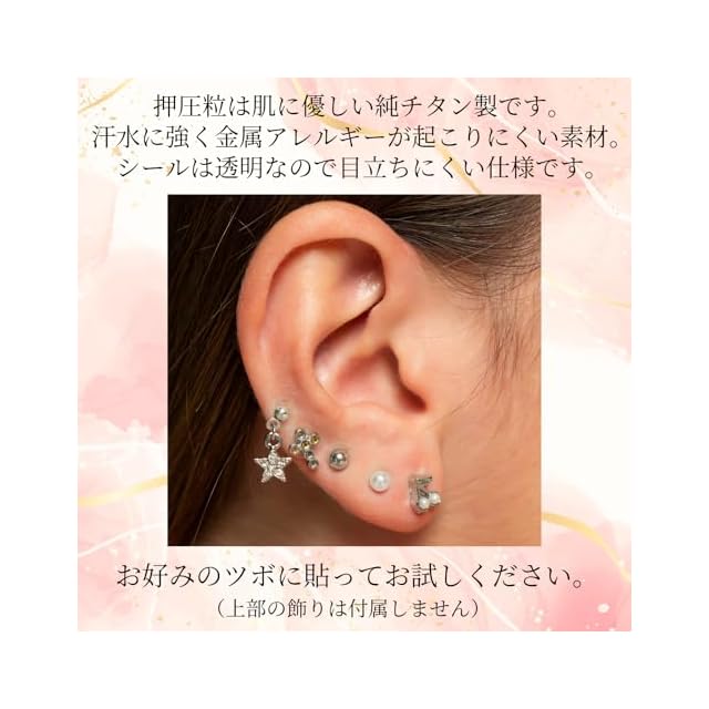 ✅製品仕様/シールサイズ:7㎜、中央抜き穴径:1.5㎜、シール材質:ポリエチレン基材、粘着剤:アクリル系粘着剤、粒素材:純チタン お届け内容:純チタン製耳つぼ100粒、透明シール100枚、耳ツボ図解。1点づつ検品を行い丁寧に梱包してお届けいたします。