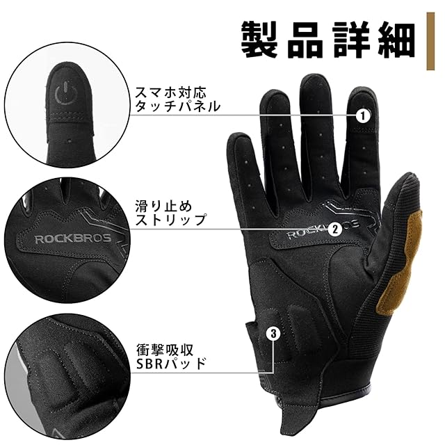 【タッチパネル対応】ROCKBROSバイクグローブは親指と人差し指の指先にはタッチパネル対応の導電性繊維の特殊素材を使用して、グローブをはめたままスマホの操作ができ、撮影したい時或いは受信する時、わざわざ脱着する手間がかからないです。