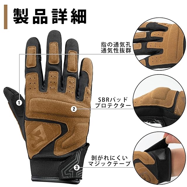 【ハードプロテクター】バイクグローブは手のひらと手の甲にSBR材質パッドを詰めて、指に保護パッドも付けて、転倒時のダメージを軽減します。プロテクト効果が必要な部分にはSBRを使用することで保護性能も確保。グローブのステッチの縫い目は丁寧で、耐久性も優れています。しかもポリエステル+ナイロン+PUの材質で作り、指が動きもよりやすいです。
