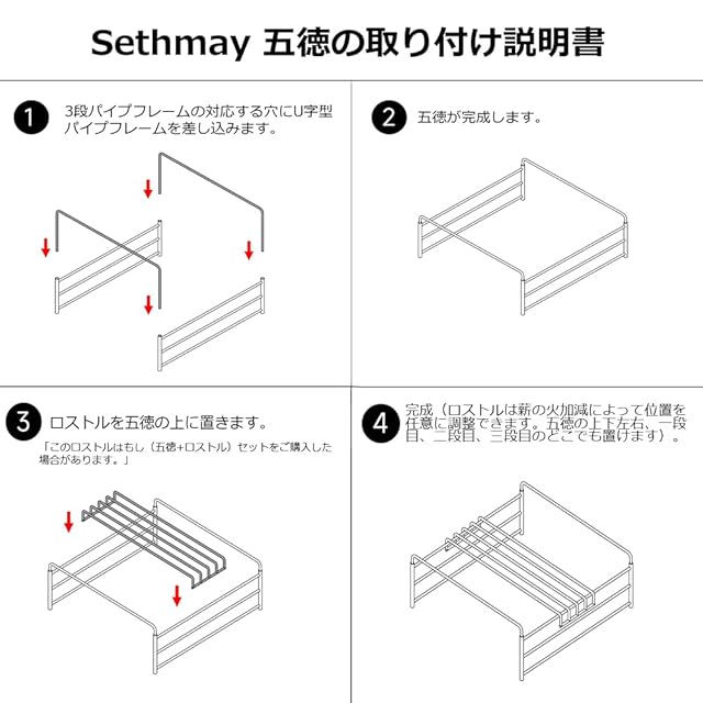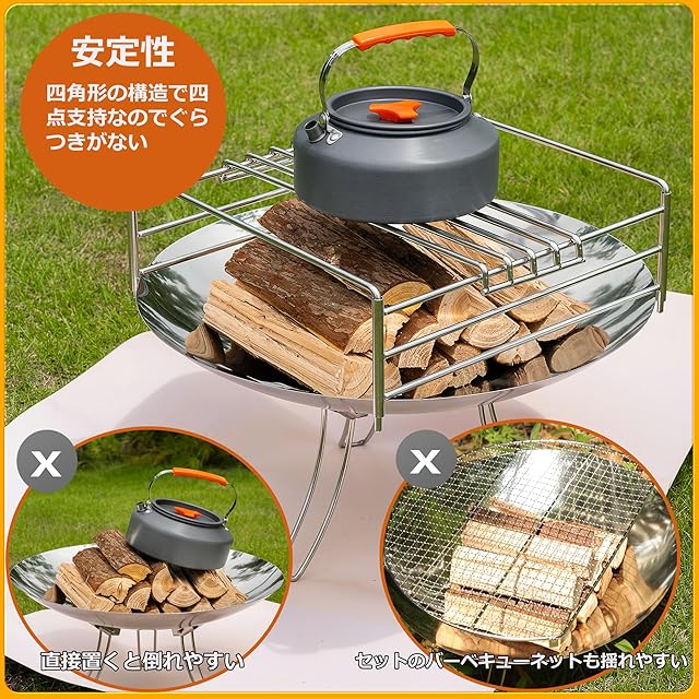 【製品内容】ステンレス304の3段パイプレーム*2、ステンレス304のU字型パイプレーム*2、ステンレス304のロストル*1、※ファイアーディスク(焚き火台)が含まれませんので、別途ご用意ください。
