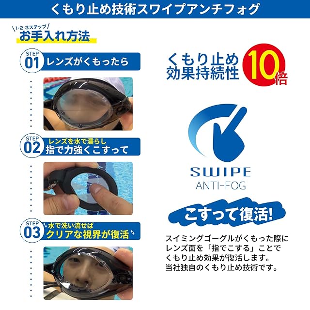 こするだけでくもり止め効果が復活するSWIPE搭載。屋外での使用でも安心のUVカットレンズ。フェイスラインによって選べる5サイズの鼻ベルト付。日本製 Fina認証モデル
