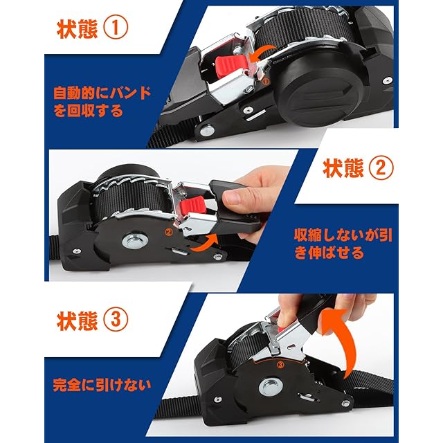 【自動巻き取り式】ボタンを一つクリックするだけで、余分な荷締めベルトの長さを簡単に引き戻せます。