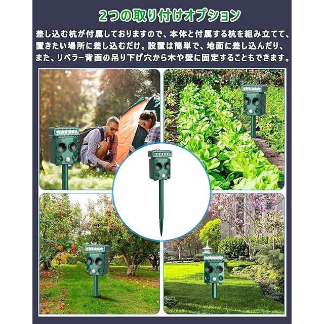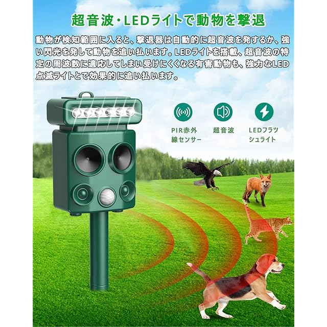 商品名:Smalife 動物撃退器 超音波 害獣撃退 [2025年最新バージョン] 害獣対策器 猫よけ 犬よけ 鳥よけ ネズミ除け USB充電&ソーラー充電 超長待機 LED強力フラッシュライト 赤外線センサー 二つ 12m感知範囲 IP68防水防塵 猫撃退 猫退治 鳥除け 犬除け 畑/庭保護 差し込み&壁掛け型の両用 日本語取扱説明書付(グリーン)