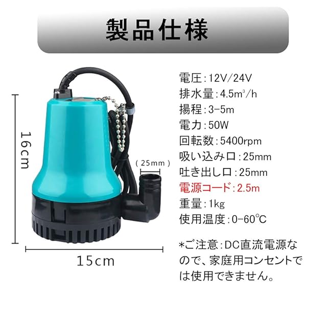 製品仕様 入力電圧:12V 入力電流:5.4A 吐水量:約70L/分(4.5㎥/時間) 全揚程::3 ~5m 海水対応:可 使用水温:0-60度 重量:1kg 吐水口口径:25mm 電源コードの長さ:2.5M サイズ:16cm(H)X15cm(W) セット内容 ポンプ本体 エルボ ワニクリップ 散水ノズル 配水管バックル(2個) 日本語取扱説明書
